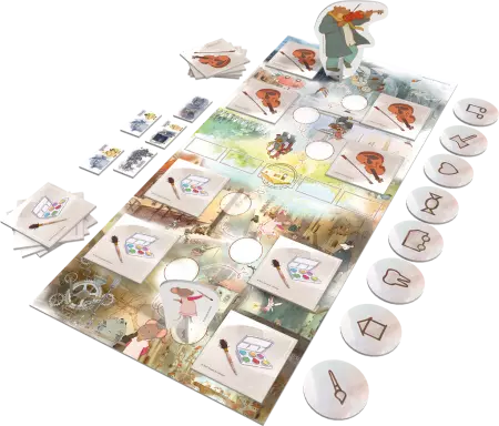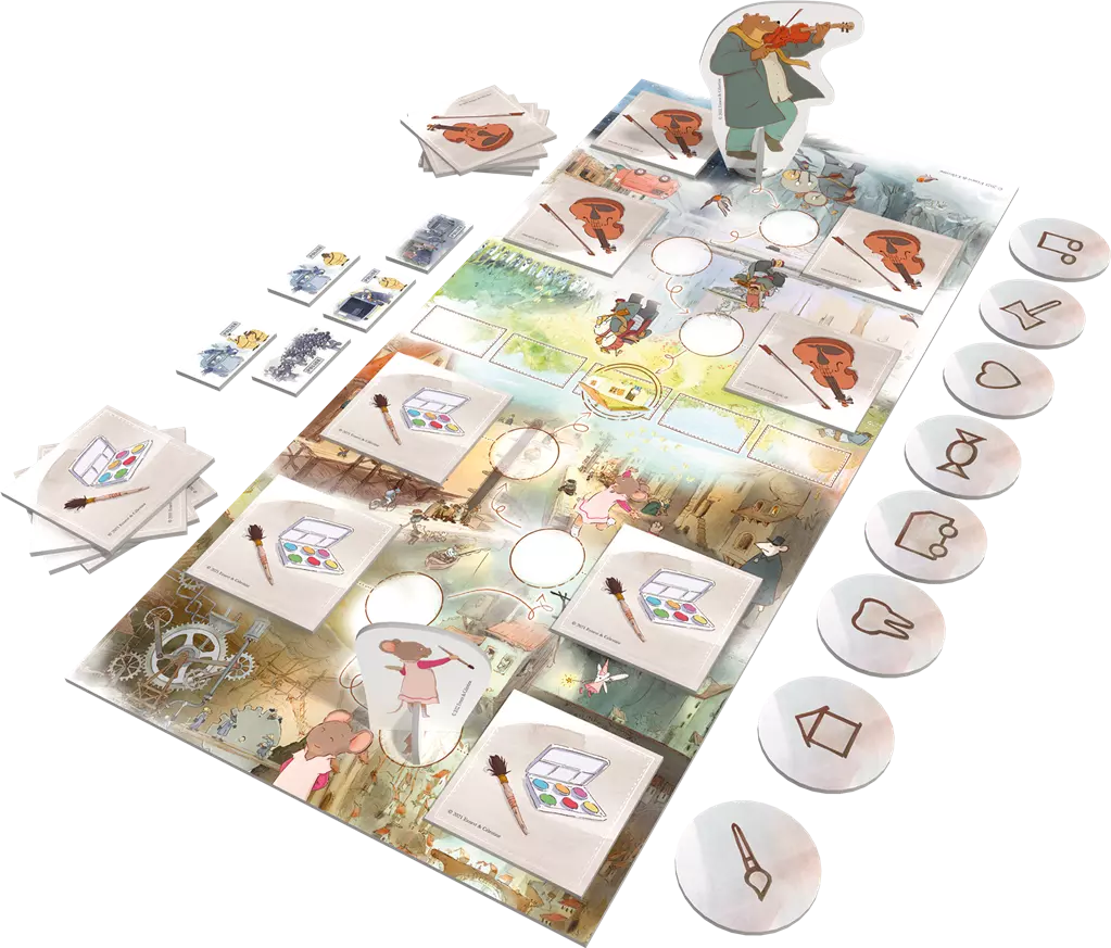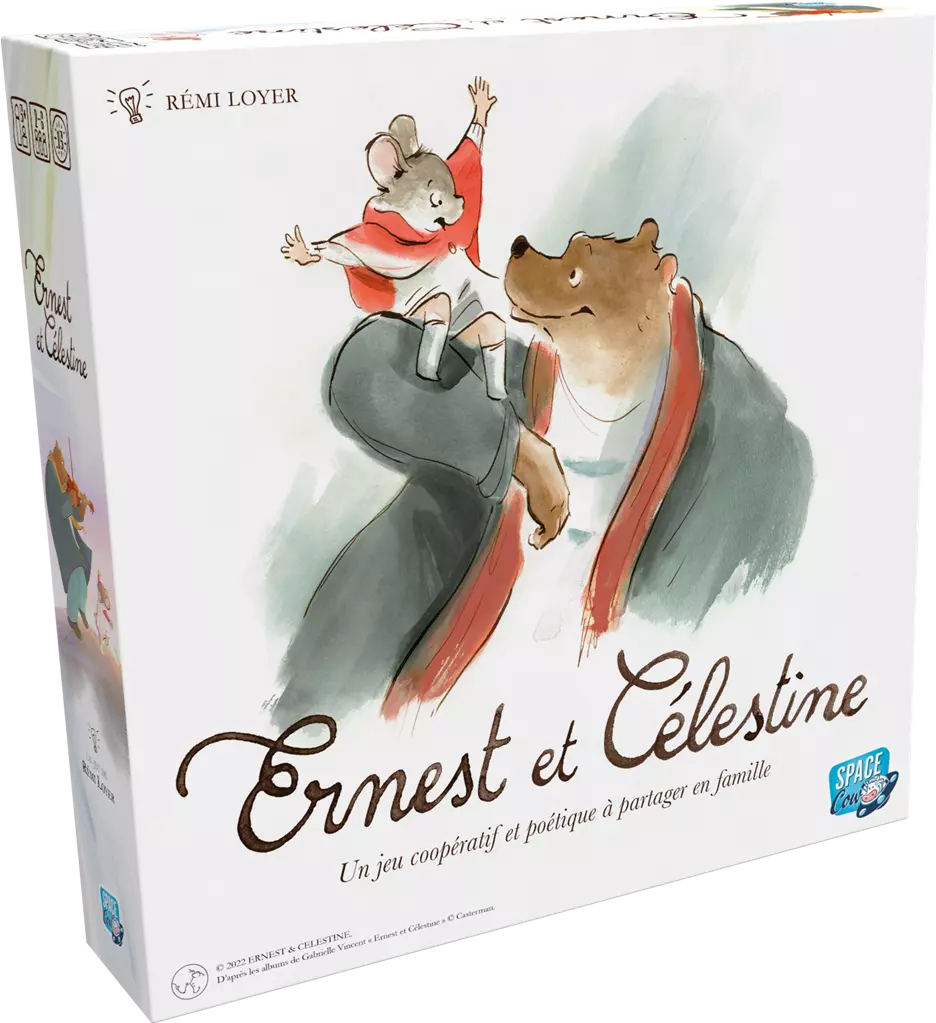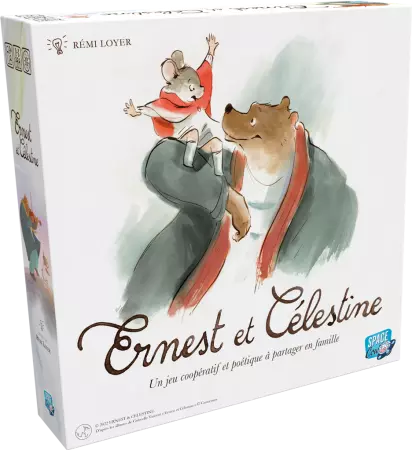 1 livret de règles, 1 plateau de jeu, des figurines d’Ernest et Célestine en carton, 8 tuiles Ernest, 8 tuiles Célestine, 5 jetons Police, 8 jetons Symbole.