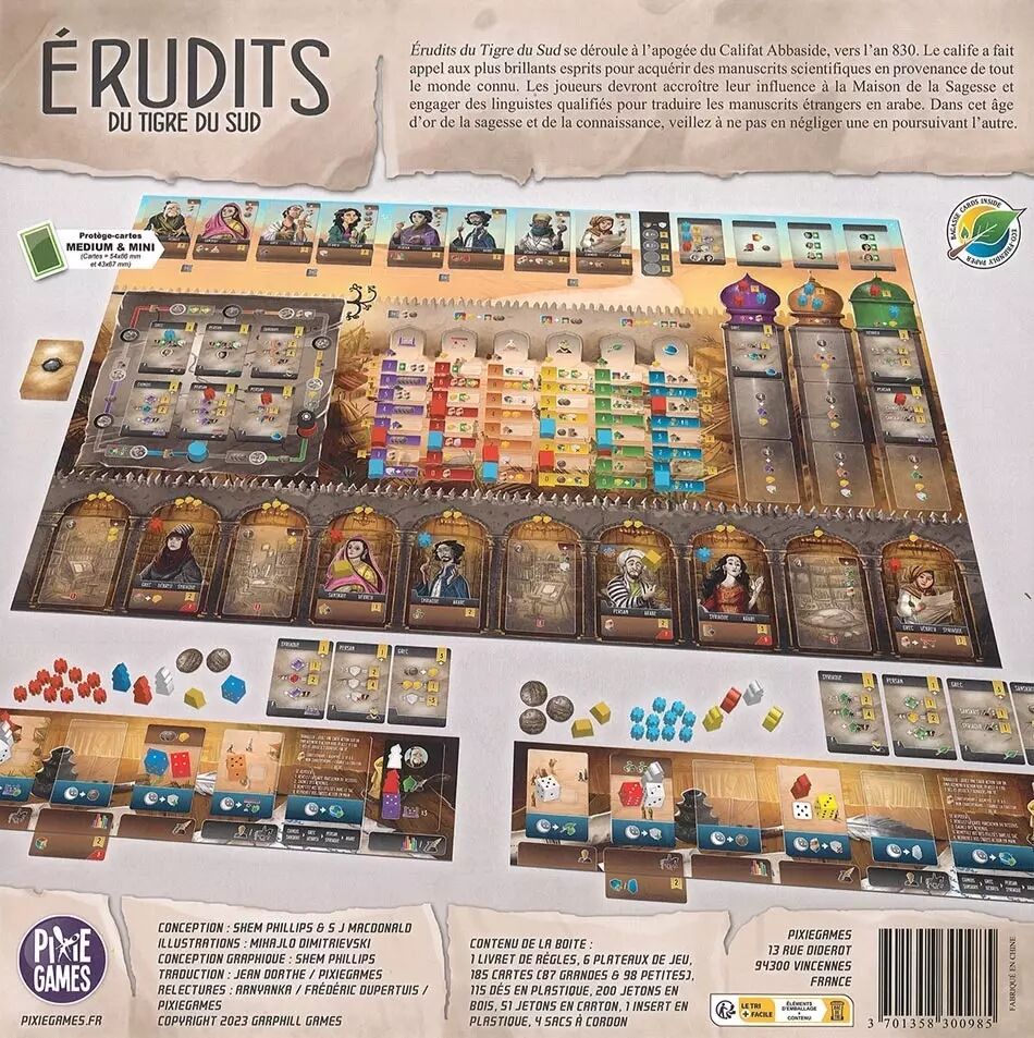 Contenu : 1 livret de règles, 6 plateaux de jeu, 185 cartes (87 grandes & 98 petites), 115 dés en plastique, 200 jetons en bois, 51 jetons en carton, 1 insert en plastique, 4 sacs à cordon