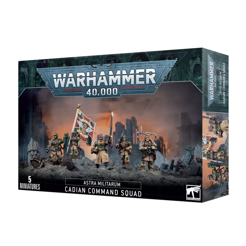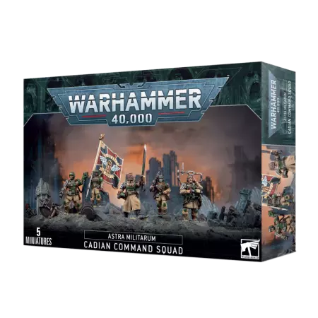Ce kit plastique permet d'assembler une Escouade de Commandement Cadienne, composée d'un Commandeur Cadien et de quatre Gardes Impériaux Vétérans. Le Commandeur Cadien est armé, selon votre choix, d'un pistolet laser, d'un pistolet bolter ou d'un pistolet à plasma dans une main et d'une épée tronçonneuse, d'une épée énergétique ou d'un gantelet énergétique dans l'autre. Chacun des Vétérans qui l'accompagnent porte un équipement différent : un médic de terrain avec un fusil laser et un médipac ; un opérateur vox avec un pistolet laser et un vox de maître ; un garde du corps avec un pistolet laser et, au choix, une épée tronçonneuse, une épée énergétique ou un gantelet énergétique ; et un porte-étendard avec un fusil laser et un étendard régimentaire. Le garde du corps et le porte-bannière peuvent à la place être assemblés avec une arme spéciale : un lance-flammes, un lance-grenades, un fuseur ou un fusil à plasma.