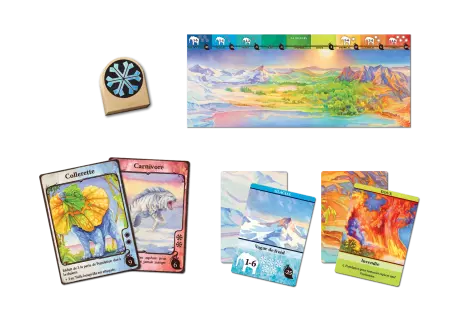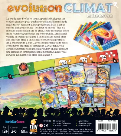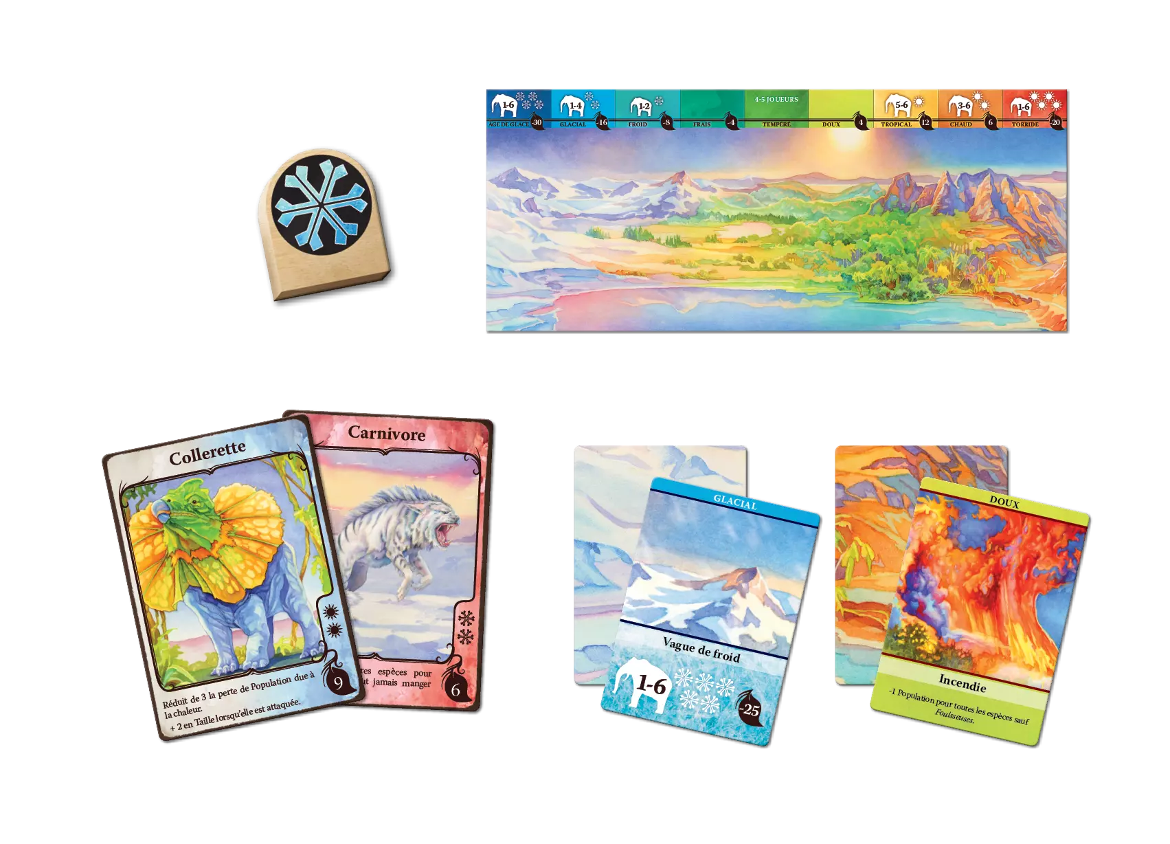 Réf. : CLIMFR01 Les bouleversements climatiques ont toujours joué un rôle de premier plan dans l'évolution des espèces. Ils affectent l'écosystème dans son intégralité, aussi bien sur le plan animal que végétal. Pour les espèces de grande taille, incapables de se rafraîchir efficacement, un climat trop chaud représente la pire des menaces. De leur côté, les espèces de petite taille se trouvent fort dépourvues face à la rigueur d'une ère glaciaire. L'extension Climat pour Evolution intègre ces nouveaux aléas climatiques au jeu en modifiant quelques éléments.