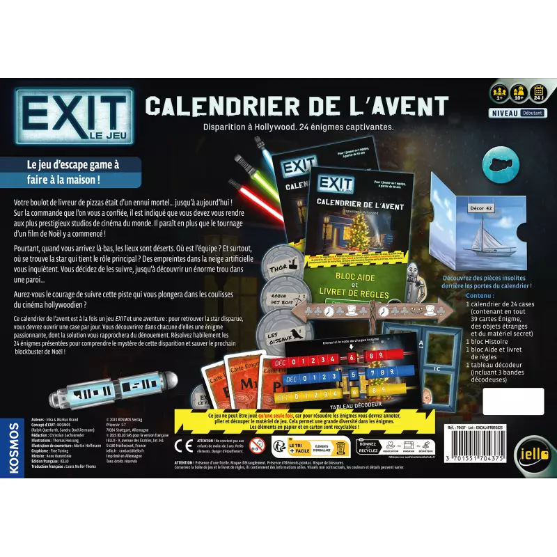 Contenu complet et riche : 1 calendrier à cases, 39 cartes énigmes, un bloc histoire palpitant, un bloc aide pour vous guider, un tableau décodeur, ainsi que du matériel secret à découvrir.
