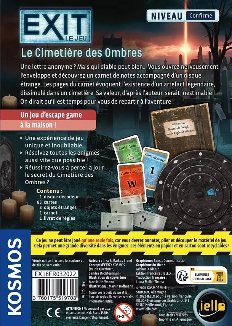 EXIT est un jeu qui reprend les sensations des "escape games". Muni d'indices, de matériel et d'un décodeur, vous aurez pour mission de sortir du jeu le plus rapidement possible.