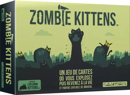 Une déclinaison encore plus délirante de Exploding Kittens jouable indépendamment ou avec d’autres boîtes de la gamme. Désormais, si vous tirez un chaton explosif et disposez d’un chaton zombie, remettez la carte mortelle dans la pioche, continuez à jouer, et ramenez un autre joueur d’entre les morts !