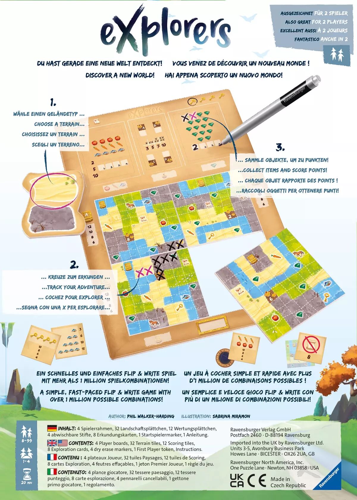 Explorateurs contient une version solo ainsi que des tuiles de tâches supplémentaires pour les joueurs expérimentés, avec plus d'un million de combinaisons de jeu possibles.