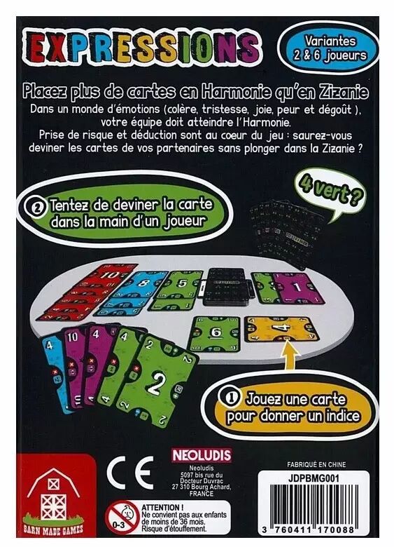 Contenu de la boîte : 1 paquet de cartes (émotions, chiffres), aides de jeu, boîte de rangement compacte