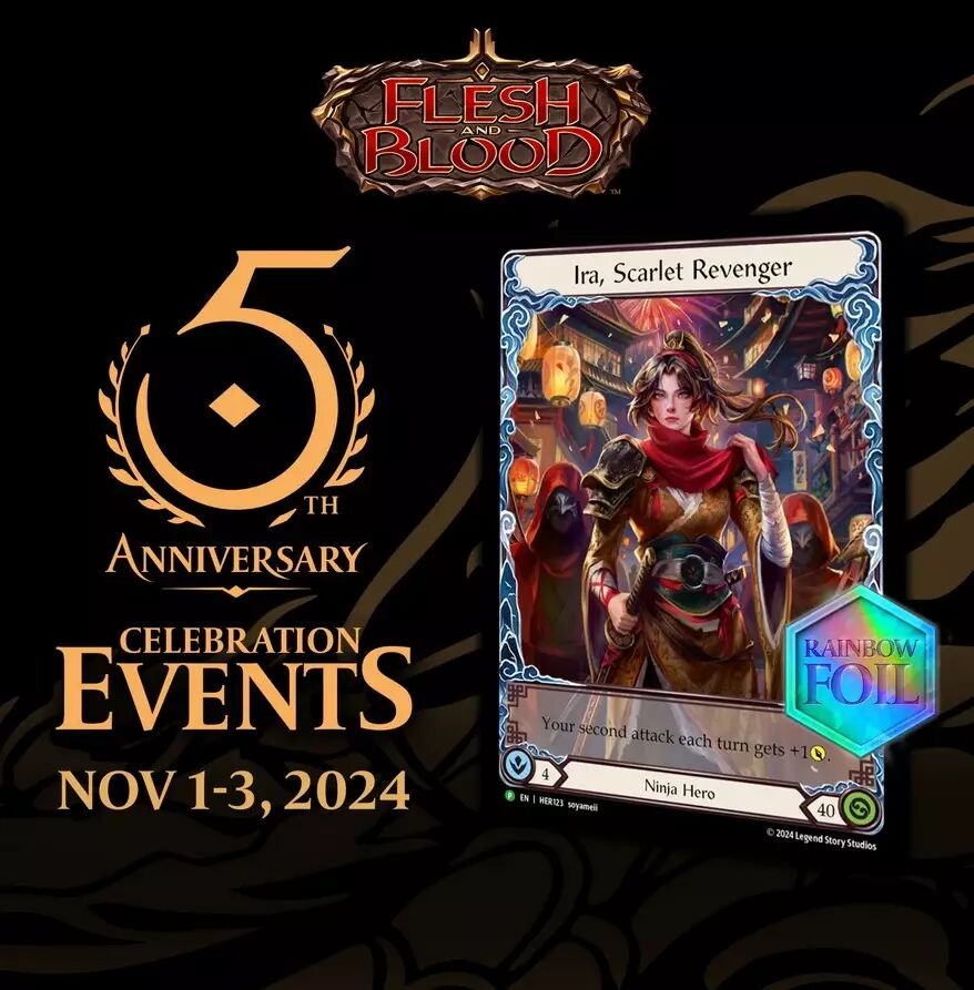 C'est l'occasion de célébrer le 5e anniversaire de Flesh and Blood avec un événement qui se déroulera le week-end du 1er au 3 novembre. Les joueurs auront la possibilité de participer et de récupérer Ira, Scarlet Revenger !