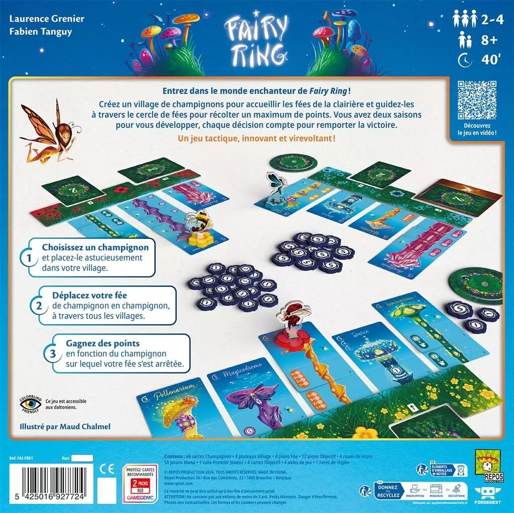 Accessible et amusant, Fairy Rings offre une grande profondeur stratégique sans complexité excessive, ce qui en fait un jeu idéal pour toute la famille. Il propose des interactions entre les joueurs, alliant un équilibre de hasard et de choix malins qui rendent chaque partie unique et remplie de surprises, même pour les plus stratèges.