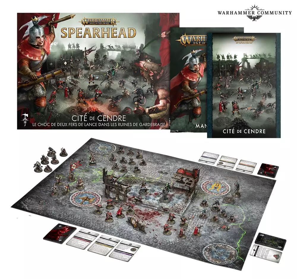Ces figurines sont parfaites pour débuter une nouvelle armée ou enrichir une collection existante. La boîte contient également un Manuel Warhammer Age of Sigmar de 72 pages rempli des règles essentielles pour jouer au jeu, un plateau de jeu double face, le livre Pack de Bataille Cité de Cendre avec de nouvelles missions et règles pour le plateau inclus dans la boîte, deux éléments de terrain de manoir en ruine, cinq objectifs relique, et un paquet de 36 cartes Fer de Lance.