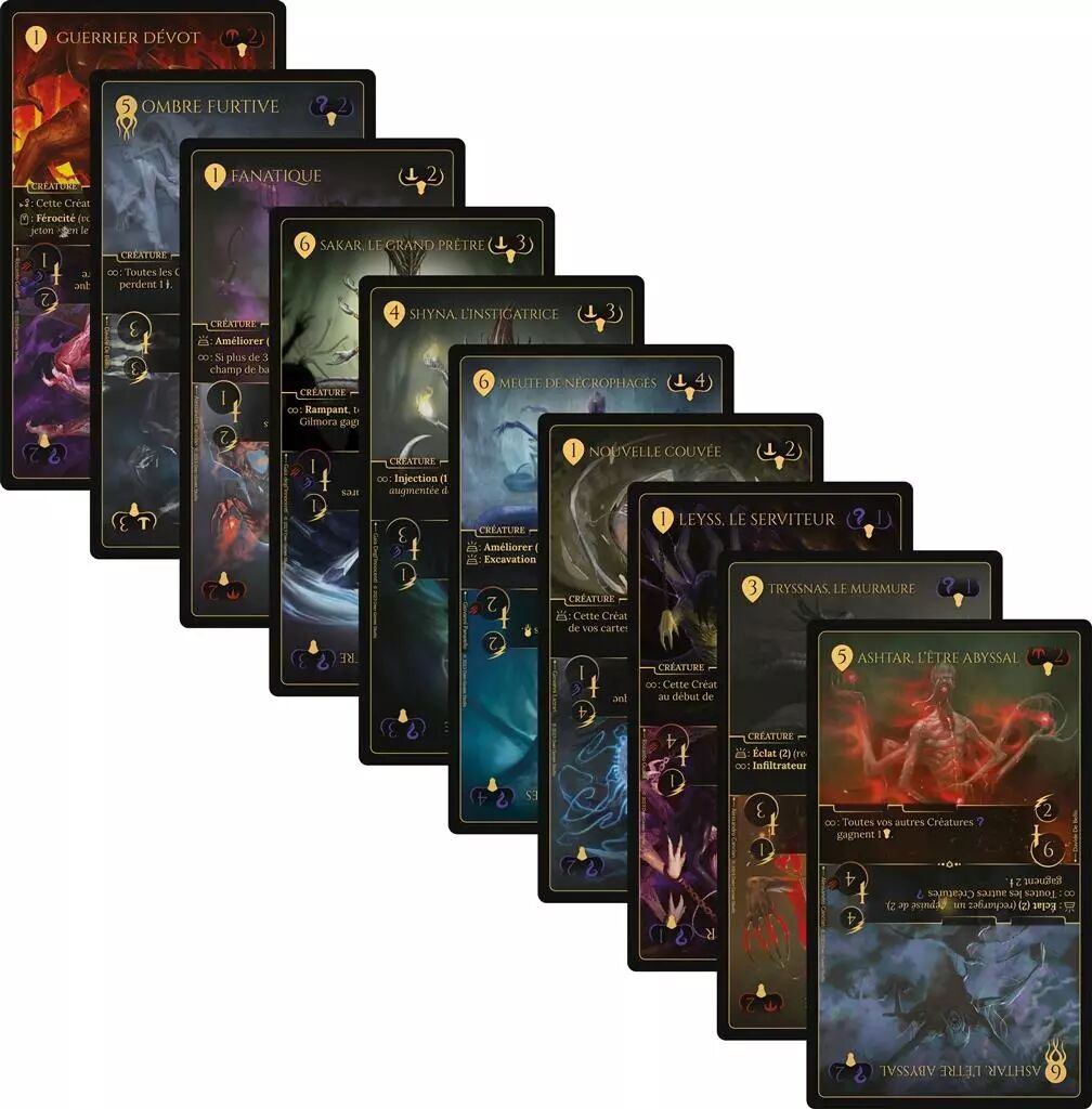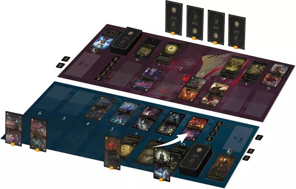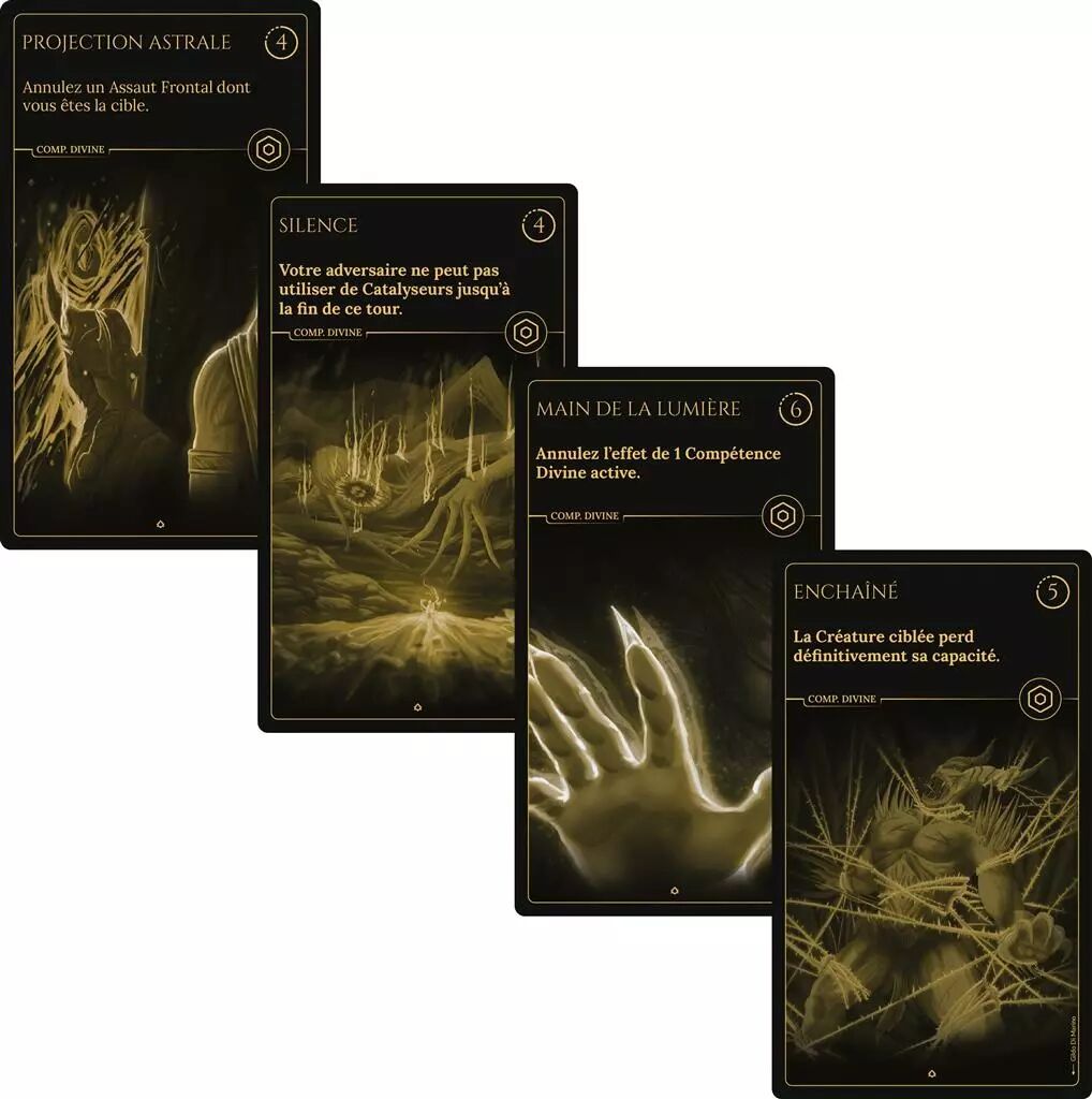 Chaque joueur dispose d’un deck de cartes, composé de créatures et de pouvoir, chacun doté d’un temps d’incubation. Posez une carte, son effet ne sera actif que lorsque le nombre de tours qu’elle nécessite sera écoulé. Utilisez vos jetons Catalyseurs pour raccourcir ce temps d’incubation, interrompre des actions, en gros changer l’issue de la bataille.