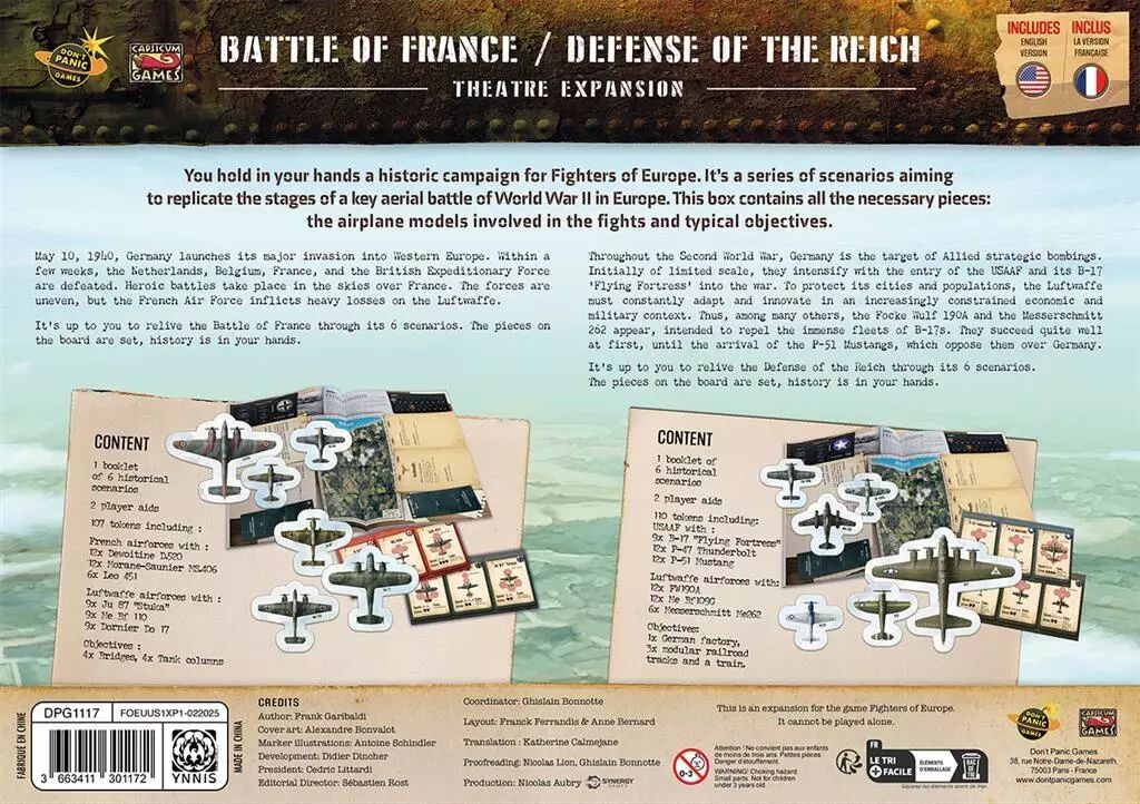 Cette extension vous propose de revivre deux grandes batailles aériennes de la seconde Guerre mondiale, la bataille de France et la défense du Reich. Les deux théâtres d’opération accueilleront 6 scénarios chacun.