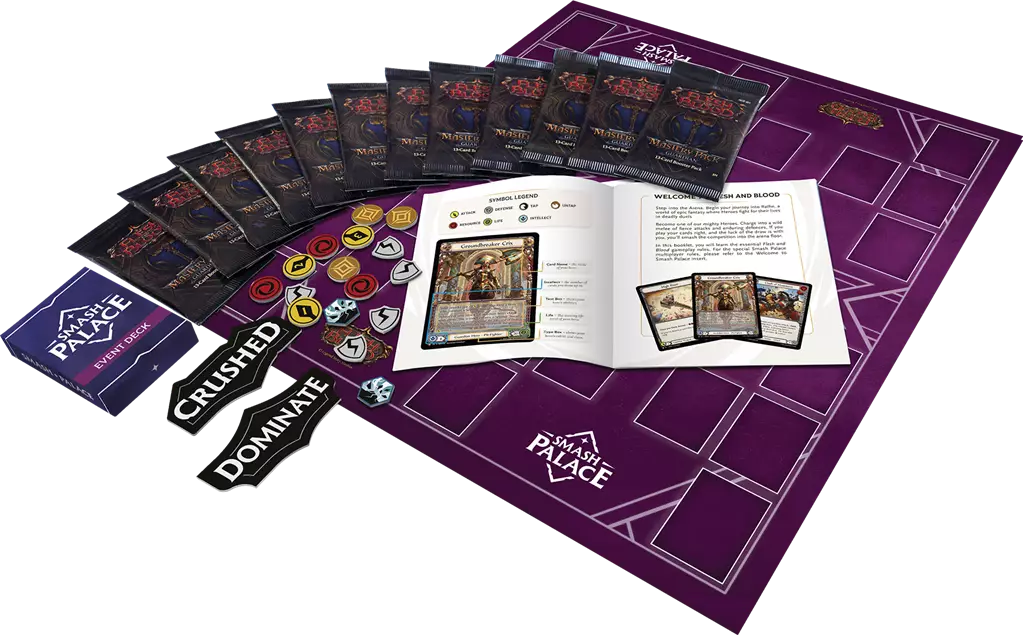Chaque joueur "casse" 3 boosters, enlève les 3 dernières cartes de chaque paquet, mélange le reste et forme son deck. À chaque tour, on tire une carte de l’Event Deck qui affecte instantanément tous les participants, modifiant tour à tour les règles ou les interactions possibles. Le but : survivre, manipuler et battre ses adversaires pour être sacré champion du Smash Palace, dans des parties courtes, fun et pleines de rebondissements.