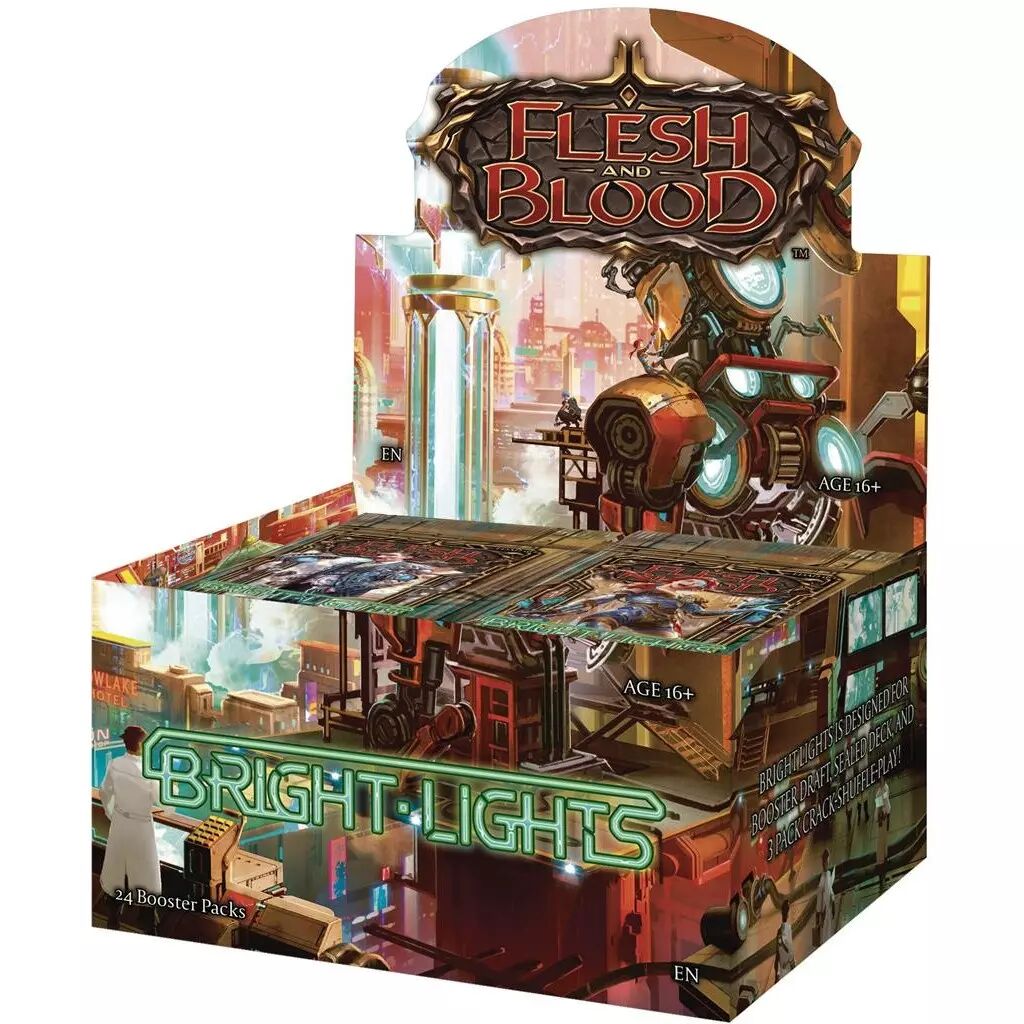 Bienvenue dans la Cité de Metrix, la métropole animée où l’ambition côtoie l’innovation, où l’avenir de Rathe est réinventé quotidiennement dans les centres de recherche de puissants conglomérats. Les héros en herbe sont attirés par les lumières vives de cette grande ville, aveuglés par les slogans des enseignes à néons qui indiquent que vous aussi pouvez « Devenir plus qu’humain ! » Bright Lights transporte le jeu Flesh and Blood aux frontières de l’innovation, avec le tout premier équipement qui commence la partie dans votre deck. Transformez votre équipement de base en équipement Évo à la pointe de la technologie et construisez la combinaison mech de vos rêves !