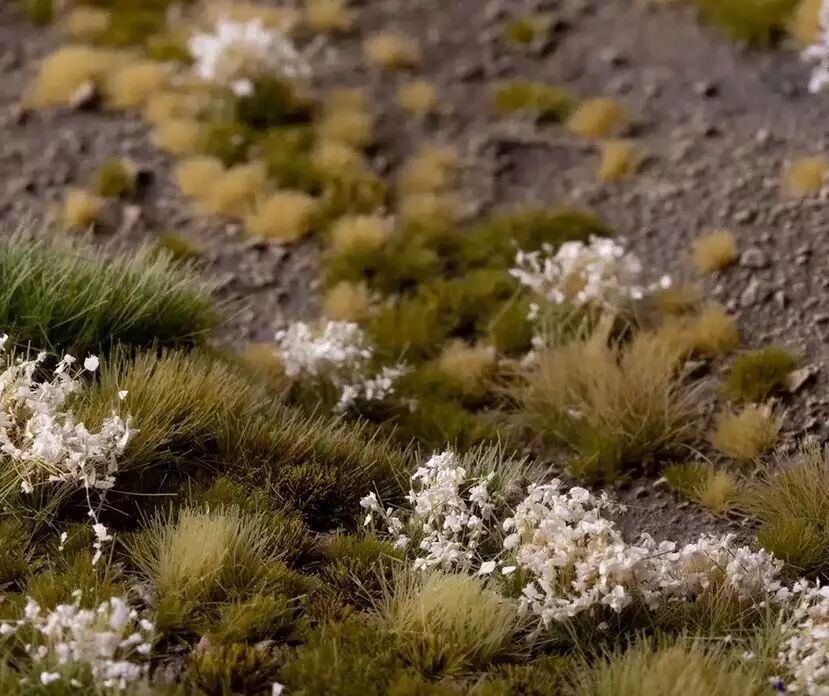 Des touffes couvertes de pétales blancs. Idéales pour simuler des bruyères, des cistes, des roses sauvages, des ronces, des lilas, des viornes, des cerisiers, des arbousiers et toutes sortes de plantes de jardin aux fleurs blanches. Seules ou mélangées avec d'autres touffes, elles apporteront des couleurs vives et du contraste à vos bases et dioramas.