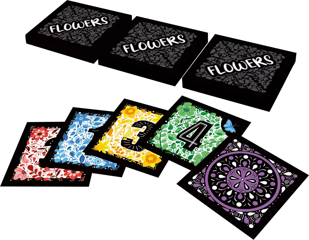 Flowers est un jeu de cartes dans lequel les joueurs s'affrontent pour créer la zone de jeu la plus optimisée possible. Pour cela, ils piochent des cartes représentant des fleurs de différentes couleurs et valeurs, et les posent sur leur plateau en respectant des règles simples :