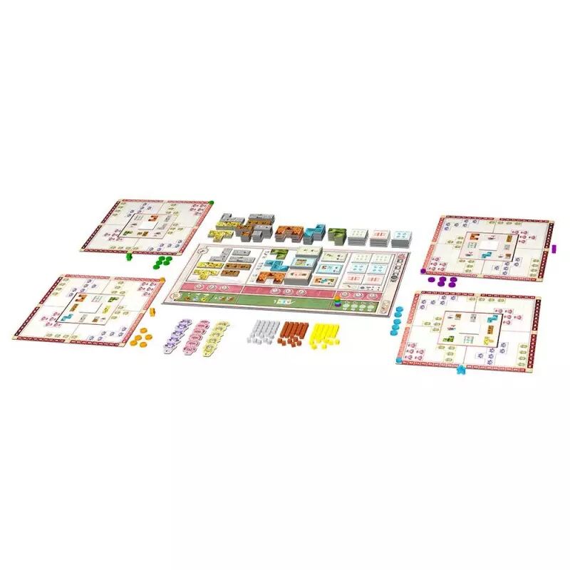 Contenu : 1 plateau central, 4 plateaux joueur, 15 tuiles masque, 36 tuiles adoration, 90 tuiles bâtiment, 5 or de taille 4, 10 or de taille 3, 5 pierre de taille 4, 11 pierre de taille 3, 14 pierre de taille 2, 10 pierre de taille 1, 11 bois de taille 3, 14 bois de taille 2, 10 bois de taille 1, 38 tuiles temple, 46 tuiles pyramide, 9 disques bonus, 1 marqueur soleil, 1 marqueur éclipse, 1 marqueur premier joueur, 24 disques action, 4 jetons faveur, 4 marqueurs score, 4 architectes, 90 cubes ressource (30 pépites, 30 pierres, 30 bois), 1 règle du jeu.
