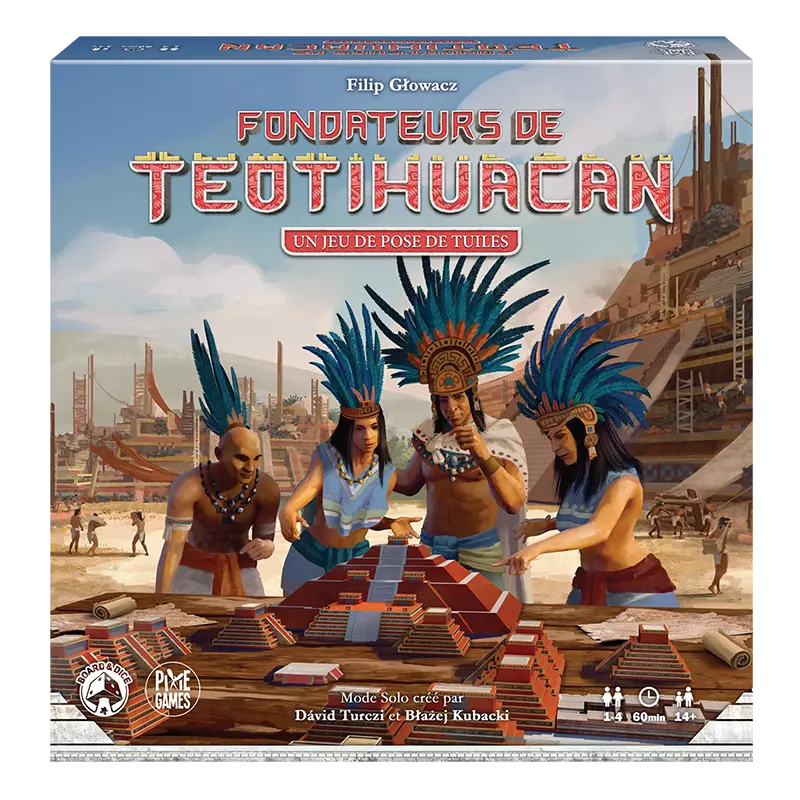 Au cours de trois à quatre tours, vous placerez vos disques d'action sur le plateau principal, formant des tours de force variable, utiliserez stratégiquement les bonus qu'ils offrent et construirez des temples, des bâtiments de ressources et la pyramide au cœur de votre projet de Teotihuacan. Vous équilibrerez la génération de ressources et leur utilisation, car trouver de bons emplacements sur votre plateau de ville devient de plus en plus difficile, et vous essayerez de déjouer vos adversaires, en utilisant un système d'action innovant et interactif. Enfin, une fois l'éclipse arrivée, tous les designs seront évalués et le joueur avec le plus de points gagnera et deviendra l'architecte pour rejoindre les rangs des Fondateurs de Teotihuacan !