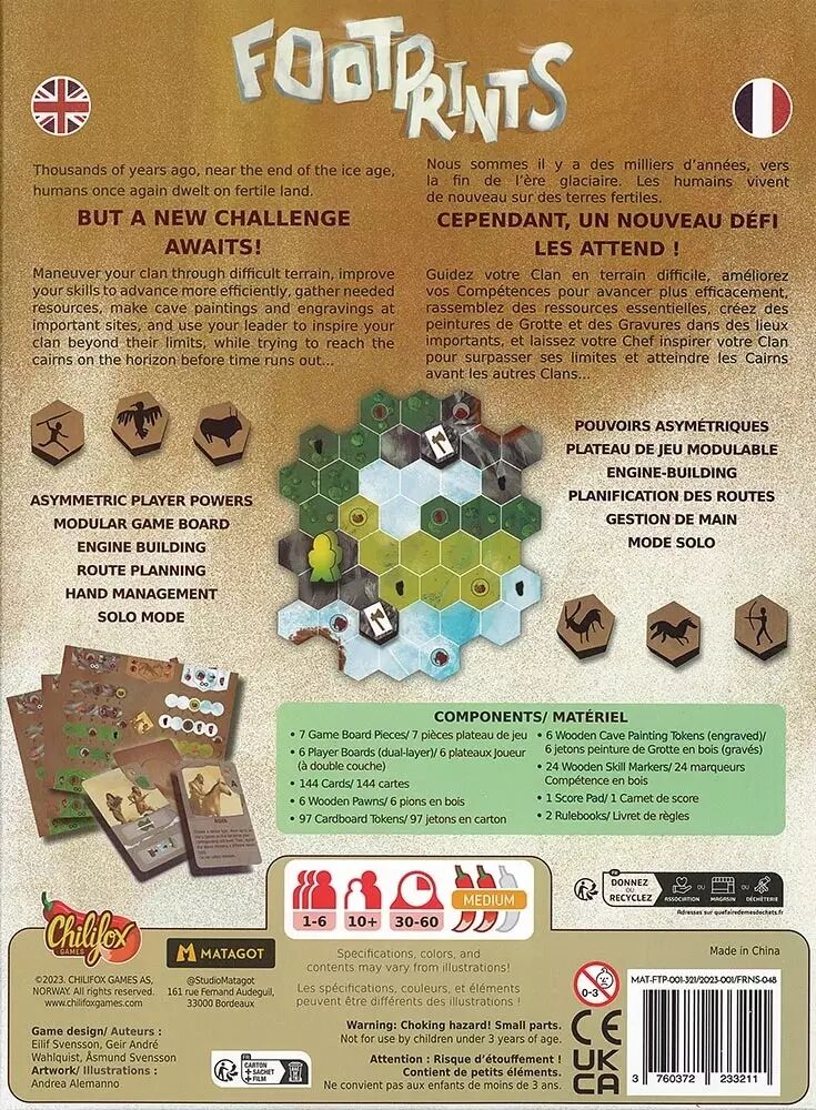Avec des règles simples et rapides à comprendre, Footprints est idéal pour les nouveaux joueurs comme pour les habitués. Chaque joueur dispose de 13 cartes de clan et d’une carte leader unique pour naviguer sur le plateau. À chaque tour, il faudra choisir entre déplacement et amélioration. Les cartes leader ajoutent une dimension tactique supplémentaire, offrant un pouvoir unique à utiliser au moment opportun.