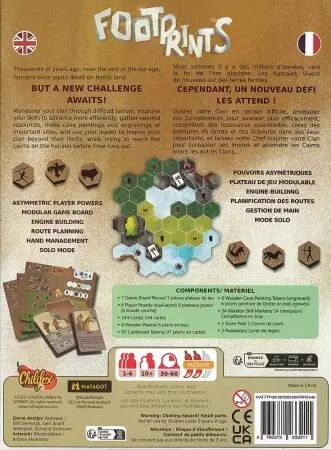 Dans Footprints, chaque joueur incarne un clan cherchant à marquer son territoire sur un terrain post-apocalyptique. En utilisant intelligemment vos cartes et ressources, vous devrez avancer sur la grille hexagonale pour récupérer des ressources vitales, tout en gravant votre empreinte sur les terres inhospitalières. La clé ? Maximiser chaque action pour ne jamais être bloqué par une mauvaise planification !