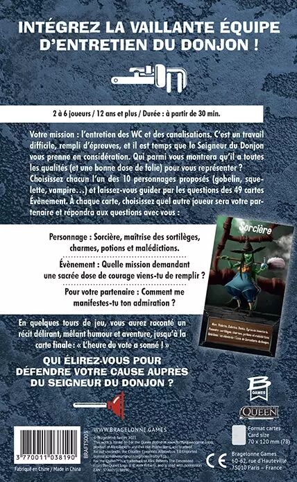 Réf. : BRDON La simplicité d'un party game, les sensations du jeu de rôle ! L'entretien des W.C. et des canalisations d'un donjon est un travail difficile, rempli d'épreuves, et il est temps que le Seigneur du Donjon vous prenne en considération. Qui parmi vous montrera qu'il a toutes les qualités (et une bonne dose de folie) pour vous représenter ?
