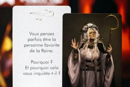 * 46 cartes Questions qui vous faciliteront te guideront le développement de vos univers, vos personnages, ainsi que les relations qui les lient entre eux et avec la Reine... et donc vos histoires !
