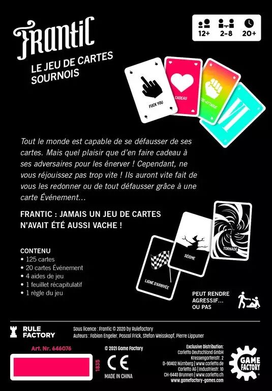 La boîte propose 125 cartes standard, 20 cartes événement, 4 aides de jeu et un feuillet récapitulatif pour prendre le jeu en main à la vitesse d’une attaque surprise. Frantic se renouvelle sans cesse grâce à sa grande variété d’effets et à la dynamique de groupe. On veut forcément y revenir pour prendre sa revanche et piéger les adversaires les plus fourbes.