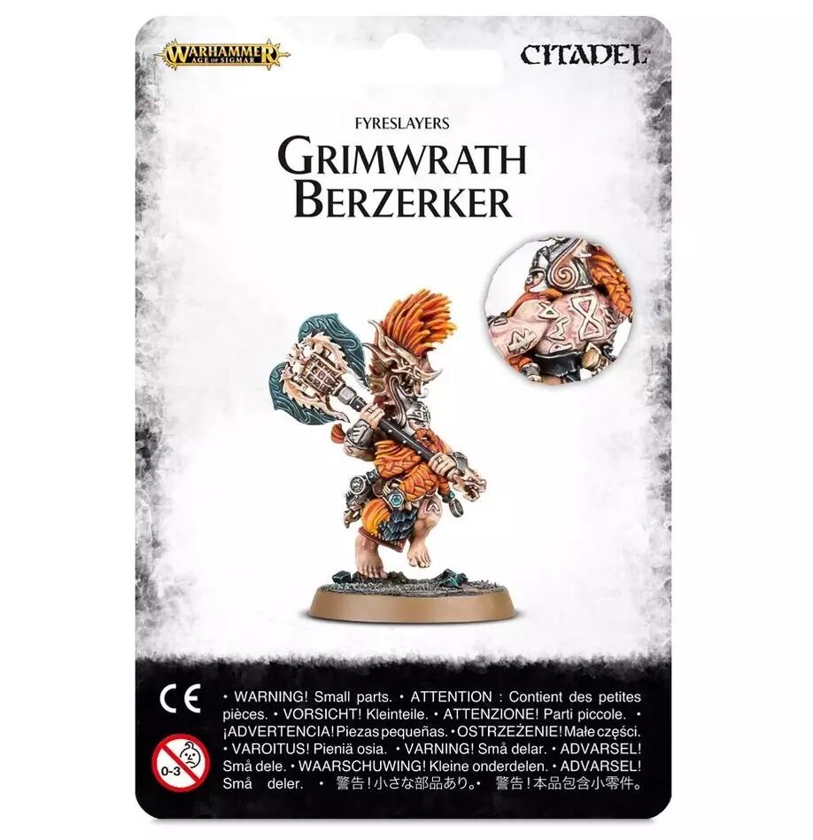 Les guerriers les plus forts et les plus habiles de leur loge, ce qui n'est pas un mince exploit chez les Fyreslayers, sont les Grimwrath Berzerkers, incarnations de la fureur de Grimnir. Ces champions obstinés ne sauraient se contenter de quelques runes d'ur-or, et ils sont couverts de dizaines de ces puissants artéfacts, qui éveillent en eux l'esprit de Grimnir, en leur conférant une résolution impitoyable, égale à leur force démesurée. La férocité de cet esprit va bien au-delà de la colère, au point que les légendes parlent de Grimwrath Berzerkers continuant à se battre malgré des plaies potentiellement fatales pour le plus gros démon, pour ne rendre l'âme qu'une fois leur mission accomplie, et le dernier ennemi abattu.