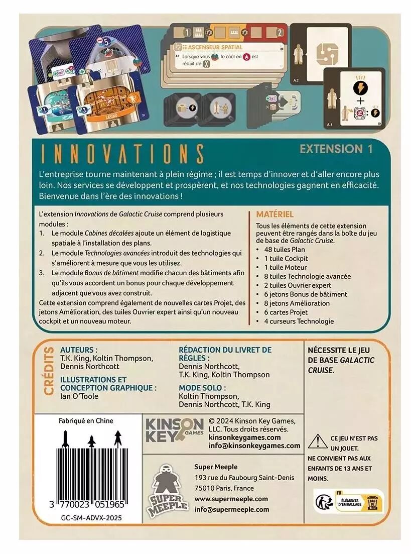 L’extension Innovations enrichit le jeu avec plusieurs modules indépendants. Découvre les technologies avancées, des plans de navette revisités qui multiplient les combinaisons, des ouvriers experts aux compétences spéciales ainsi que des cartes Projet renouvelées. Ces modules peuvent être ajoutés séparément ou ensemble pour des sessions à la carte, renouvelant à chaque fois les plaisirs ludiques.