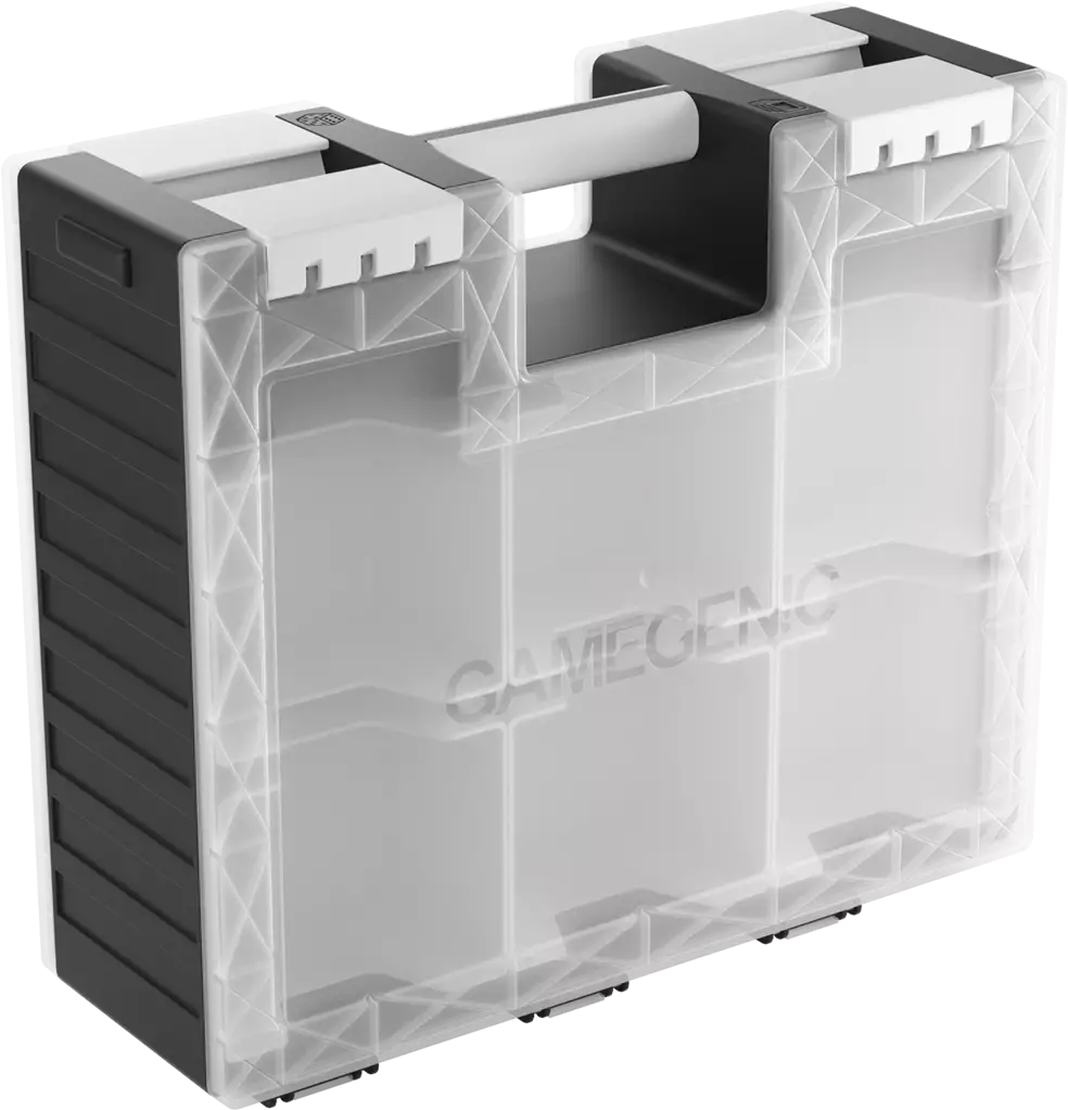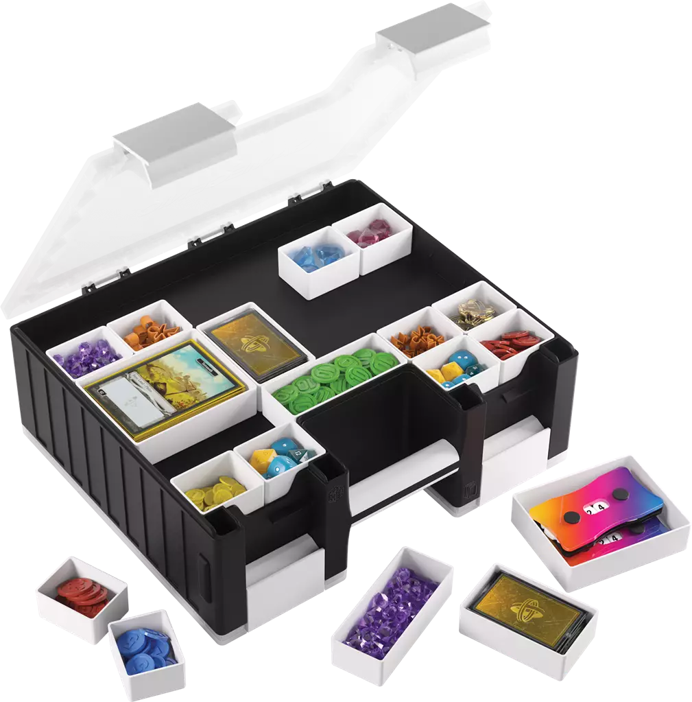 Le Game Castle est une solution ingénieuse, double face et tout-en-un pour les joueurs de plateau, de cartes et les amateurs de jeux de table. Ce tout nouveau produit peut être ouvert des deux côtés pour permettre un accès séparé à un grand nombre de cartes et de jetons. Le design innovant permet un stockage sûr tout en permettant un transport facile et confortable lors des soirées de jeux ou des tournois grâce à la poignée renforcée intégrée et à la bandoulière détachable et ajustable.