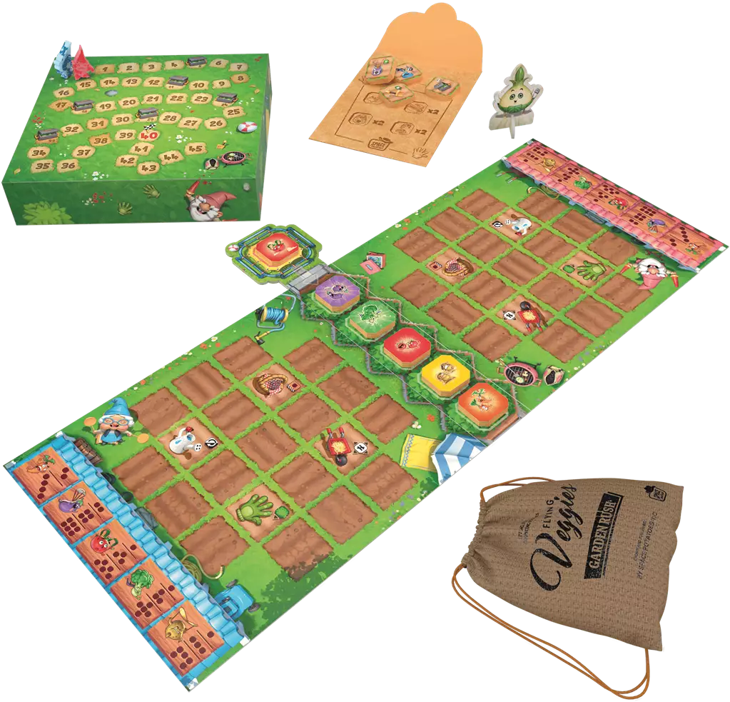 Dans ce jeu à 2, les joueurs s’affrontent, font pousser des légumes dans leur jardin et remplissent leur panier. Une planification minutieuse est nécessaire pour poser chaque jeton afin de former le modèle permettant la future récolte futures, tout en gardant un œil sur la haie partagée entre les jardins, où apparaissent les nouveaux pions légumes.