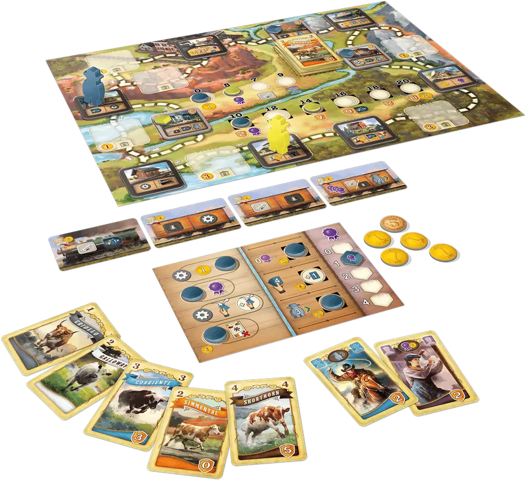Le jeu se déroule en tours successifs où chaque joueur avance son pion sur le parcours, modifie sa main de cartes Bétail et optimise ses actions. Les espaces permettent d’acheter du bétail, construire des bâtiments offrant des bonus variés ou investir dans le réseau ferroviaire. À chaque étape, vos choix influencent directement votre stratégie globale.