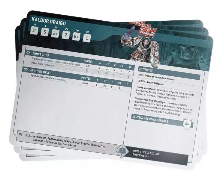 - 28x Cartes de Fiche Technique Grey Knights: Frère-capitaine, Frère-capitaine Stern, Champion de Confrérie, Chapelain de Confrérie, Archiviste de Confrérie, Techmarine de Confrérie, Escouade Terminator de Confrérie, Castellan Crowe, Grand Maître, Grand Maître en Cuirasse Némésis, Grand Maître Voldus, Land Raider des Grey Knights, Land Raider Crusader des Grey Knights, Land Raider Redeemer des Grey Knights, Razorback des Grey Knights, Rhino des Grey Knights, Intercepteur Stormhawk des Grey Knights, Escorteur Stormraven des Grey Knights, Escorteur Stormtalon des Grey Knights, Dreadnought Vénérable des Grey Knights, Escouade Interceptor, Kaldor Draigo, Cuirassier Némésis, Escouade Paladin, Escouade Purgator, Escouade Purificator, Servitors, Escouade d’Incursion