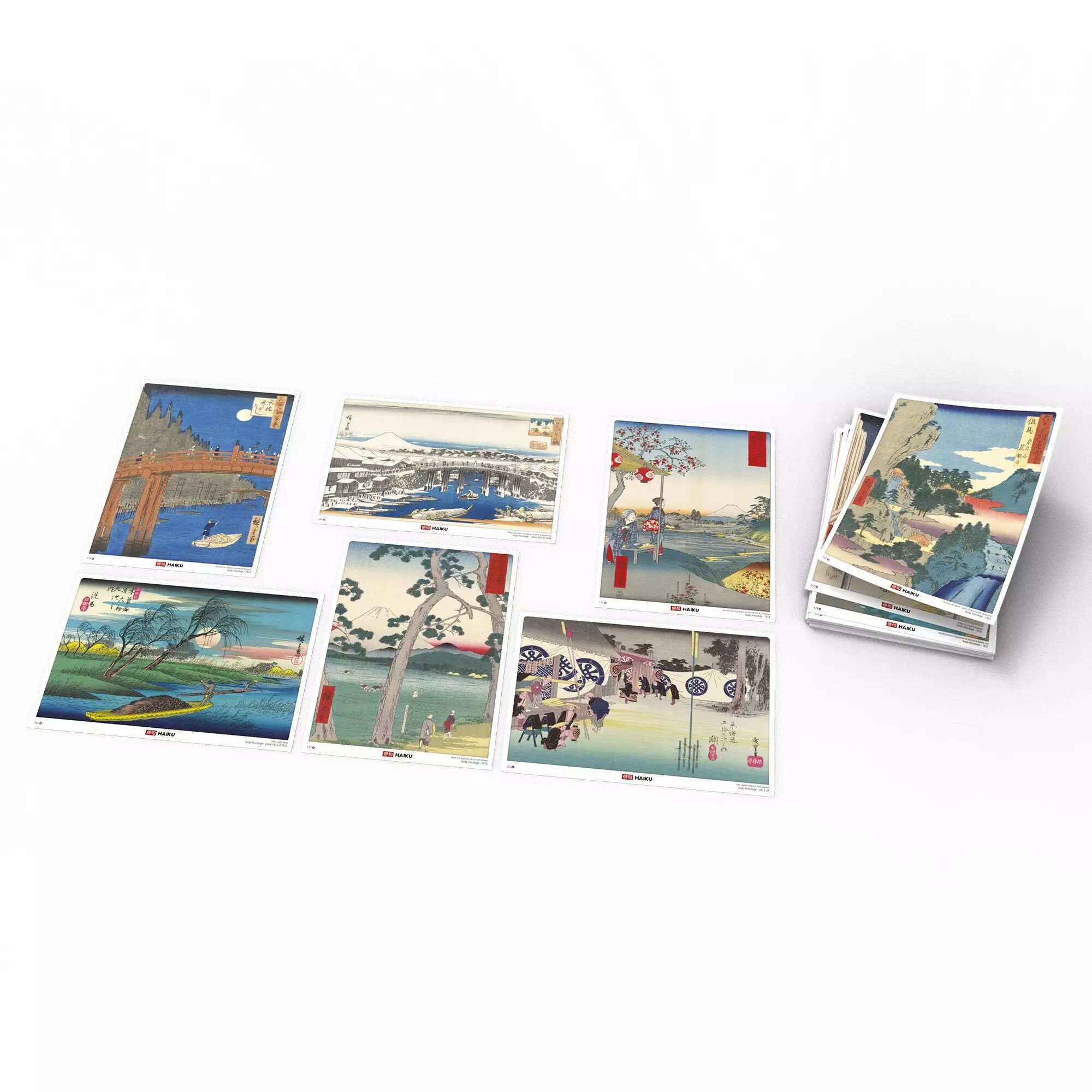 Cette extension repose sur l'une des plus célèbres séries d'estampes de l'histoire de l'art japonais : les 53 stations du Tokaïdo d'Ando Hiroshige. Entre 1832 et 1834, cet illustre maître ukiyo-e a immortalisé les 500 kilomètres de route reliant Edo (l'actuelle Tokyo) à Kyoto, avec une précision esthétique stupéfiante. L'extension puise 48 estampes dans cette vaste œuvre, transformant chaque image en source d'inspiration poétique. Contrairement aux estampes génériques du jeu de base, celles-ci racontent des histoires précises : des auberges de voyageurs, des ponts architecturaux, des paysages saisonniers, des villages perchés. Ces images ont une âme, une narrativité qui transcende le simple graphisme. Quand vous composez un haiku inspiré par la gare de Kanaya, vous invoquez vraiment ce lieu, ses voyageurs, son époque révolue.