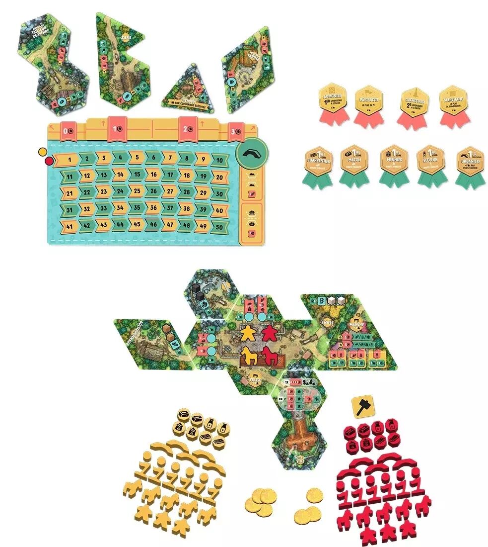 Dans l'univers captivant d'Hamlet, chaque joueur se voit confier un ouvrier et un fidèle âne. Dès le coup d'envoi, le plateau dévoile ses premiers éléments, incluant la tuile de l'église imposante, les tuiles de carrière, de bûcheron et de ferme indispensables pour récolter les ressources de base, ainsi que les incontournables tuiles marché et mairie.