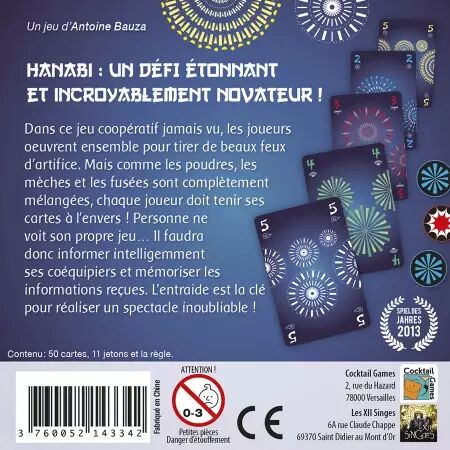 Les joueurs œuvrent ensemble pour tirer de beaux feux d'artifice. Mais chaque joueur doit tenir son jeu à l'envers : on ne voit pas ses propres cartes ! Il faut donc informer intelligemment ses partenaires, sur les valeurs et les couleurs, et mémoriser les informations reçues. Une expérience incroyable...
