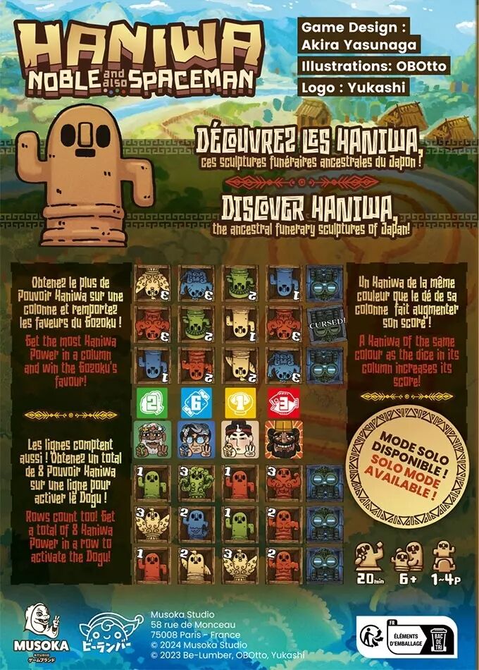 Haniwa vous invite à découvrir l'art ancestral des sculptures funéraires japonaises. Dans ce jeu de placement de tuiles, vous incarnez un sculpteur de Haniwa qui doit rivaliser de talent pour gagner les faveurs des Gōzoku, des clans puissants de l'époque des Kofun.
