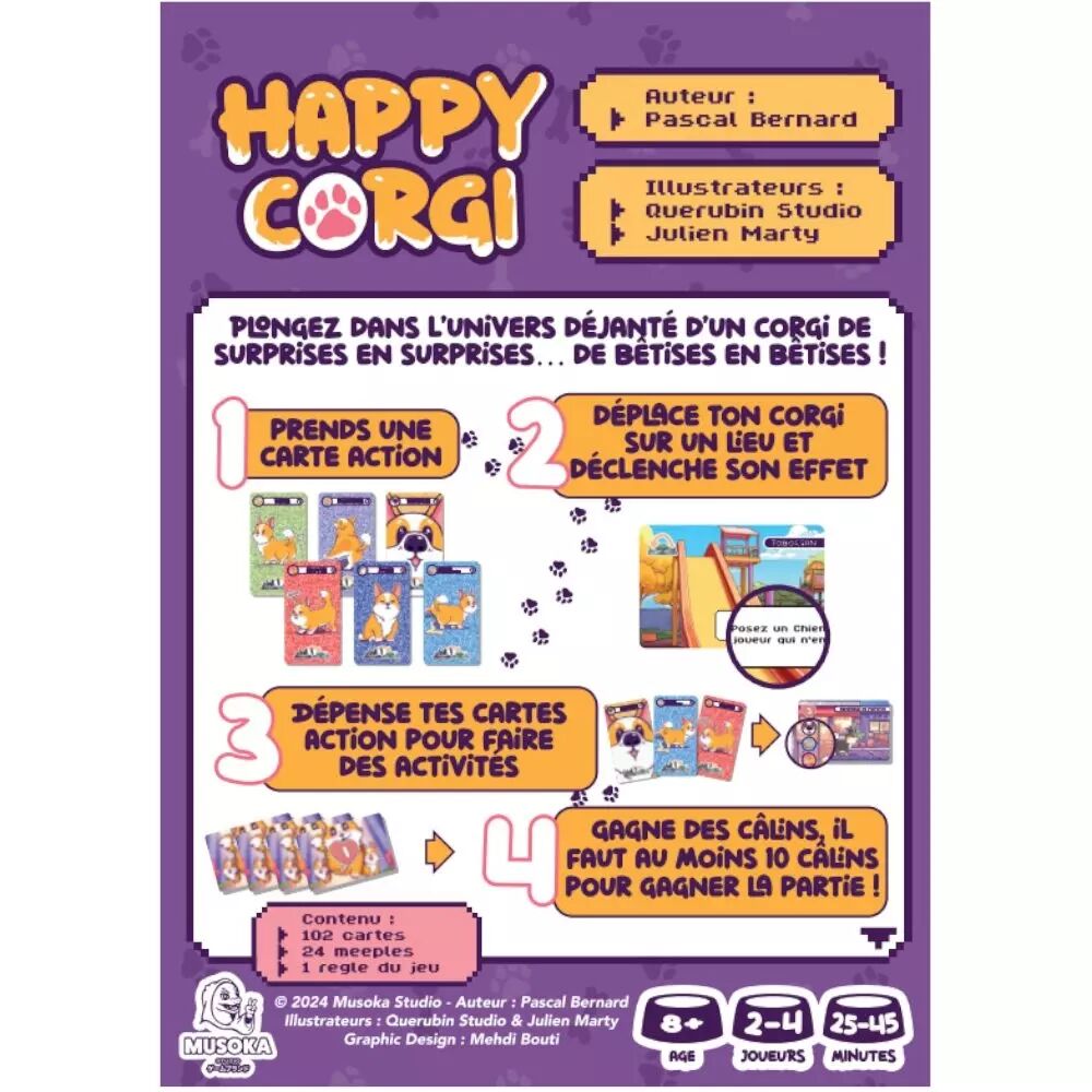 Happy Corgi est un jeu simple à apprendre et à prendre en main, ce qui le rend idéal pour initier les enfants aux jeux de société. Les règles sont claires et les mécaniques de jeu sont faciles à comprendre, pour des parties pleines de plaisir et d'apprentissage.