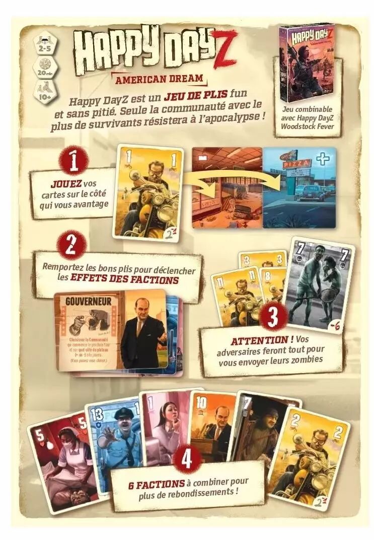 Le jeu brille par son ambiance survoltée. Chacun incarne une communauté de survivants, confrontée aux coups bas des autres joueurs et aux attaques de zombies. Les pouvoirs uniques des différentes factions – motards, cheerleaders, policiers, etc. – ajoutent une dose de fun et de rebondissements, tout en maintenant la tension jusqu’au dernier pli. Les interactions sont nombreuses, et les retournements de situation garantis.