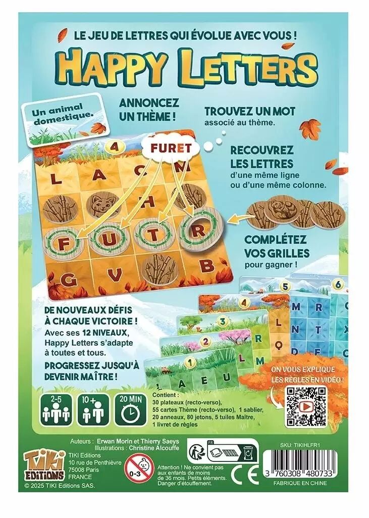 Happy Letters plonge tout le monde dans une ambiance compétitive et joyeuse. Chaque joueur tente de composer des mots en lien avec un thème, en utilisant un maximum de lettres simultanées sur son plateau. Les règles simples et la variété des grilles permettent de s’amuser dès la première partie, petits et grands compris.