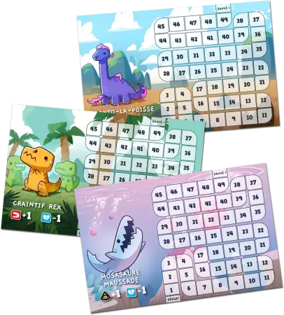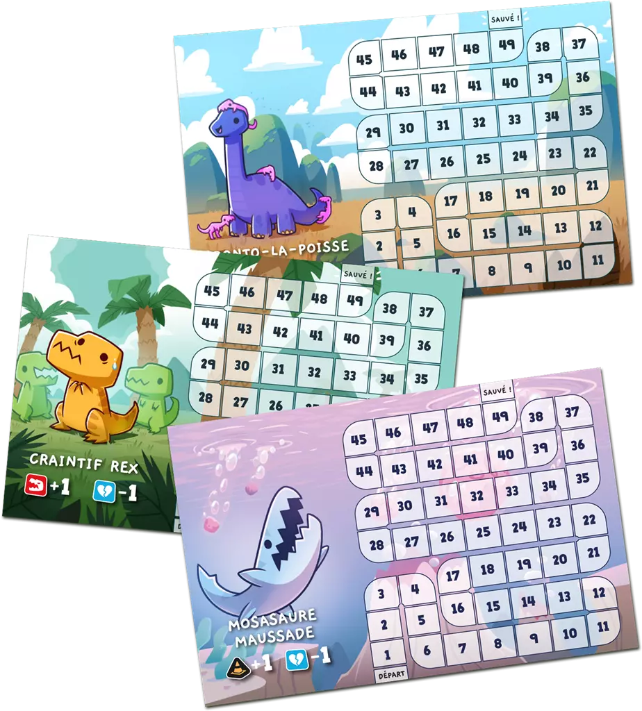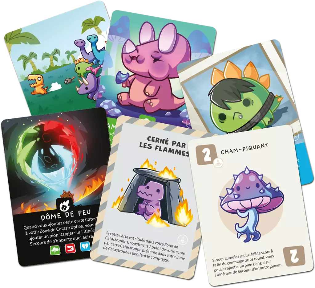 Lorsque le pion Dinosaure d'un joueur atteint une case avec un jeton Danger, ce joueur doit ajouter la carte supérieure de la pioche Danger face visible à sa Zone de Danger. Les cartes de danger ont un effet qui donne aux joueurs des désavantages tout au long du jeu. (Les cartes de danger restent dans votre zone de danger à moins qu'un effet de carte ne vous permette de les retirer).