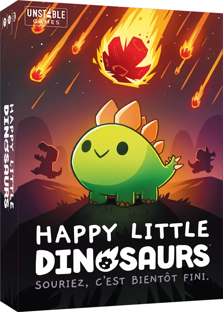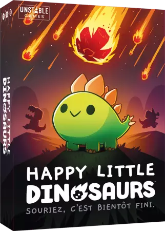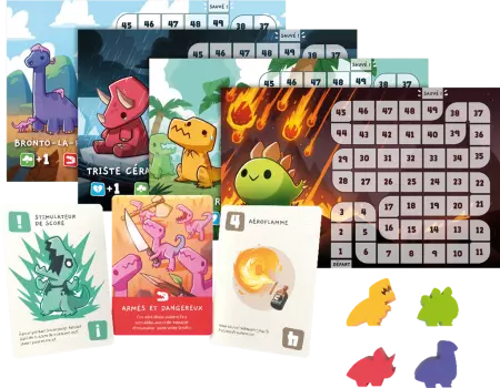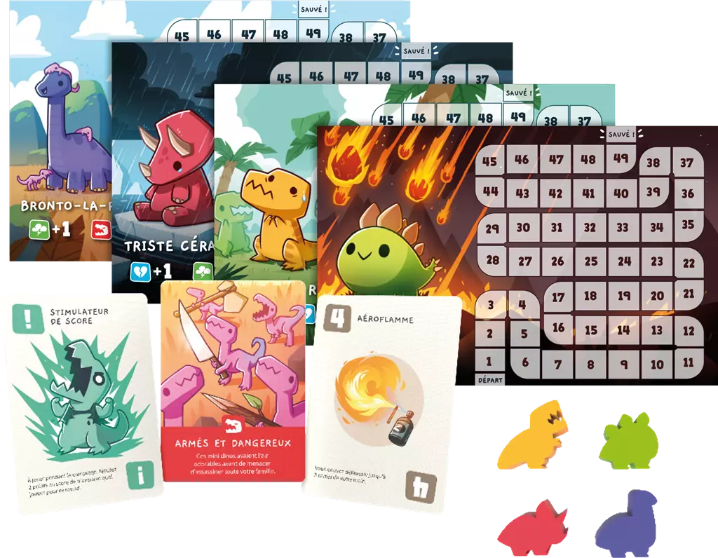 Inclus: 97 cartes de taille standard au total (28 cartes Catastrophe), 4 plateaux de joueurs dinosaures, 4 meeples dinosaures et 1 livret de règles.