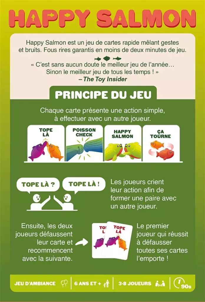 Happy Salmon est un jeu de cartes aussi simple qu'efficace. Chaque joueur dispose d'un paquet identique et doit trouver un partenaire pour réaliser l'action indiquée sur sa carte. High five, changement de place, check du poing ou fameux "Happy Salmon", chaque action se fait en duo et le premier qui se débarrasse de toutes ses cartes remporte la partie. Le tout en criant, gesticulant et riant aux éclats !