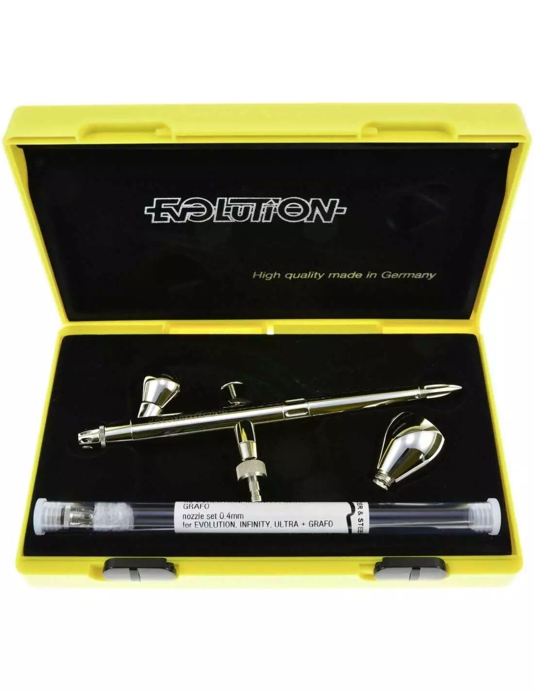 Découvrez l'excellence en matière d'aérographie avec l'aérographe Evolution 2 en 1 de Harder & Steenbeck. Cet aérographe a atteint le statut de best-seller grâce à sa conception solide, à sa fabrication exceptionnelle et à sa capacité de double action fluide, ce qui en fait un choix privilégié depuis son lancement.