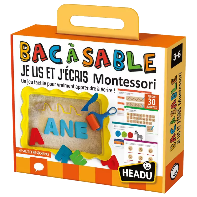 Le Bac à sable Montessori permet d’engager l’enfant dans des activités de pré écriture puis d’écriture de lettres, de mots et de chiffres. Le jeu contient du sable de différentes couleurs qui ne sèche et ne salit pas, des moules des lettres de l’alphabet ainsi qu’un manuel pédagogique proposant des exercices amusants !
