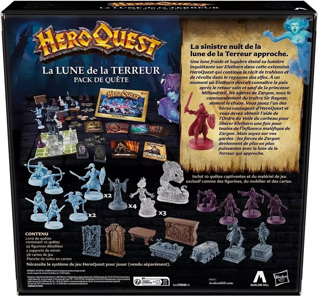 En tant que courageux chevalier, vous devez libérer Elethorn des griffes de Zargon. Embarquez pour de dangereuses quêtes et demandez l'aide du Cadre du Voile du Corbeau pour empêcher les forces d'épouvante de Zargon de détruire le royaume. Naviguez dans un sombre labyrinthe de voies d'eau, une ville souterraine et d'autres lieux périlleux. Mais méfiez-vous, car les forces de Zargon deviennent de plus en plus puissantes avec la montée de la Lune de la Terreur ! Plongez dans l'aventure avec 10 quêtes audacieuses, de superbes illustrations, 29 figurines détaillées et des tuiles en couleur.