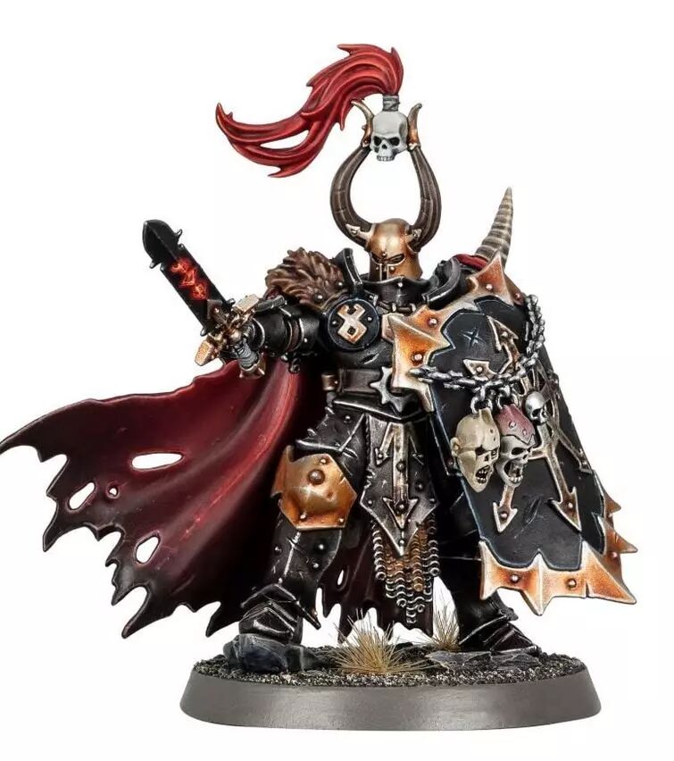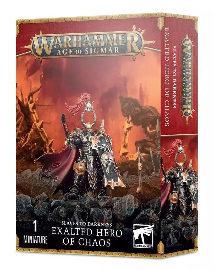 Ce kit plastique permet d'assembler un Héros Exalté du Chaos, un champion ambitieux qui s'est élevé dans les rangs des Guerriers du Chaos. Engoncée dans une sinistre armure avec une cape volant au vent, cette figurine est sculptée avec une arme levée dans un geste de défi. Le Héros Exalté peut être armé soit d'une paire de haches, soit d'une lame gravée de runes et d'un bouclier runique du Chaos, qui peut être orné de chaînes d'où pendent les têtes d'ennemis abattus. Ce kit contient également au choix une tête avec un casque cornu ou une tête nue avec un chignon haut et des pointes mutantes.
