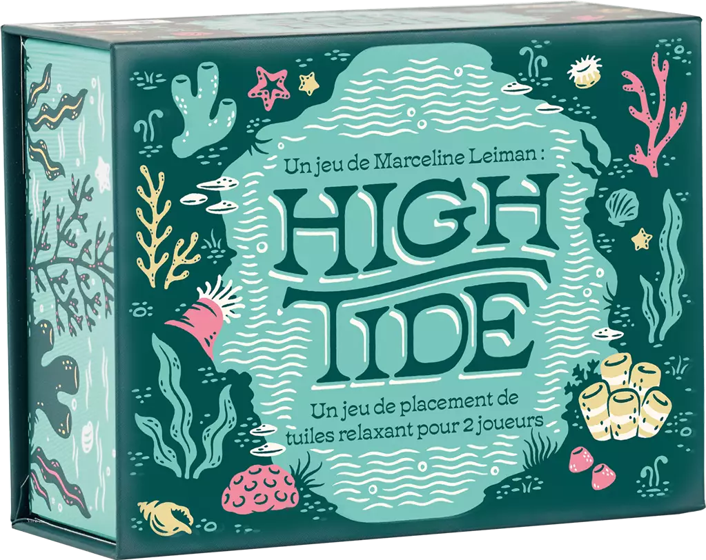 Au gré des marées, les coquillages et crustacés s'amoncellent sur la plage. Dans ce jeu de stratégie abstrait pour 2 joueurs inspiré par le bord de mer (High Tide signifie Marée Haute), vous devrez empilez vos tuiles hexagonales sur celles de votre adversaires. Tentez tour après tour de les recouvrir pour maximiser votre visibilité en fin de partie. Cette mécanique accessible dissimule une vraie tension stratégique. La partie s'achève lorsque l'un de vous ne peut plus déplacer de tuiles lors de son tour. En cas d'égalité, c'est la hauteur de vos piles qui détermine le gagnant de la manche. Le jeu se joue en 3 manches gagnantes.