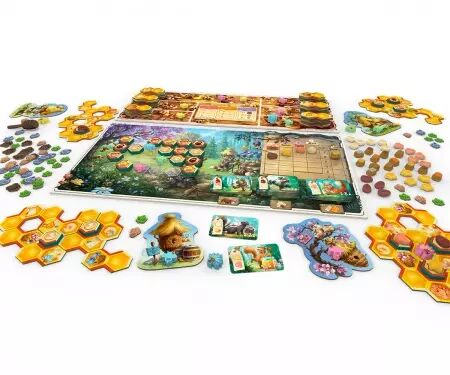 Ainsi, quand une tuile est placée pour compléter un schéma précis, un ensemble d'actions est activé dans l'ordre choisi par le joueur. Une tuile draftée au premier tour pourra être activée jusqu'à 3 fois pendant la partie. Cela dépend finalement de la façon dont le joueur place ses beeples (Bee/abeille + meeple) et construit leur ruche. Après tout, dans le business du miel, l'efficacité est reine. Alors que vous faites croître constamment votre ruche, vous allez forer pour du nectar et du pollen, produire du miel, vendre différentes variétés au marché des ours, proposer des goûts de miel, et vous occuper de la Reine et sa cour. Il y a si peu de nectar à obtenir, et le trouver ne sera pas facile. Les joueurs devront fouiller les champs de nectar et faire attention aux recherches des adversaires pour essayer de déduire la localisation du nectar dont ils ont tant besoin.