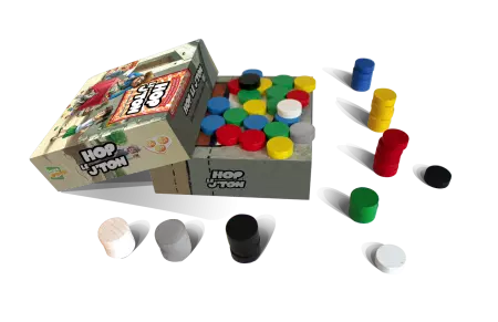 La boite retournée sert de terrain de jeu. Chaque joueur possède en début de partie son set de j'tons d'une même couleur. On place sur le terrain trois j'tons : un blanc, un gris et un noir. Les joueurs jouent chacun leur tour dans le sens de vissage (ce n'est pas plus arbitraire que celui des aiguilles d'une montre), en posant dans la zone marron un, deux ou trois de leur j'tons, et en poussant le couvercle de la boite jusqu'au trait noir. Chacun joue ainsi jusqu'à ce que des j'tons tombent de la boite. Si des j'tons de couleur tombent, le propriétaire de la couleur récupère ses j'tons qui seront des munitions pour rejouer. Si des j'tons blancs, gris ou noirs tombent, ils rapportent des points (respectivement un, deux ou trois points) !
