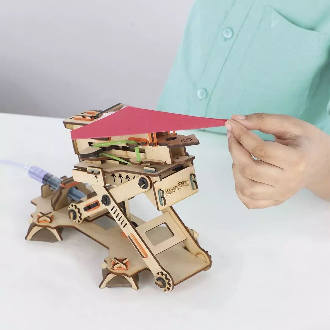 Envolez-vous vers le ciel avec la catapulte hydraulique pour avions de Smartivity ! Utilisez la pression hydraulique pour lancer des avions en papier et des fléches en mousse. Assemblez votre propre catapulte à pression hydraulique à l'aide du manuel d'instructions facile à comprendre pour lancer vos avions en papier. Décorez les avec votre peinture ou vos marqueurs et pliez vos propres avions en papier ou bien les modèles proposés. Remplissez la seringue d'eau et hop, votre avion en papier décolle ! Un jeu amusant pour comprendre des notions d'hydraulique, les mécanismes de ciseaux et bien sur l'aérodynamique.Pièces en bois et en plastique prédécoupées, bouchons, seringues hydrauliques, missile souple, trombone, crochet, élastiques, manuel de construction illustré étape par étape