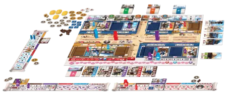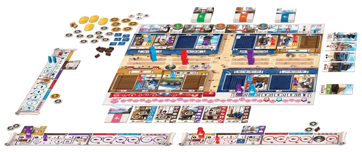 Contenu : 1 plateau, 4 plateaux joueur, 70 cartes, 83 éléments en bois, 147 jetons, 1 carnet de score, la règle du jeu